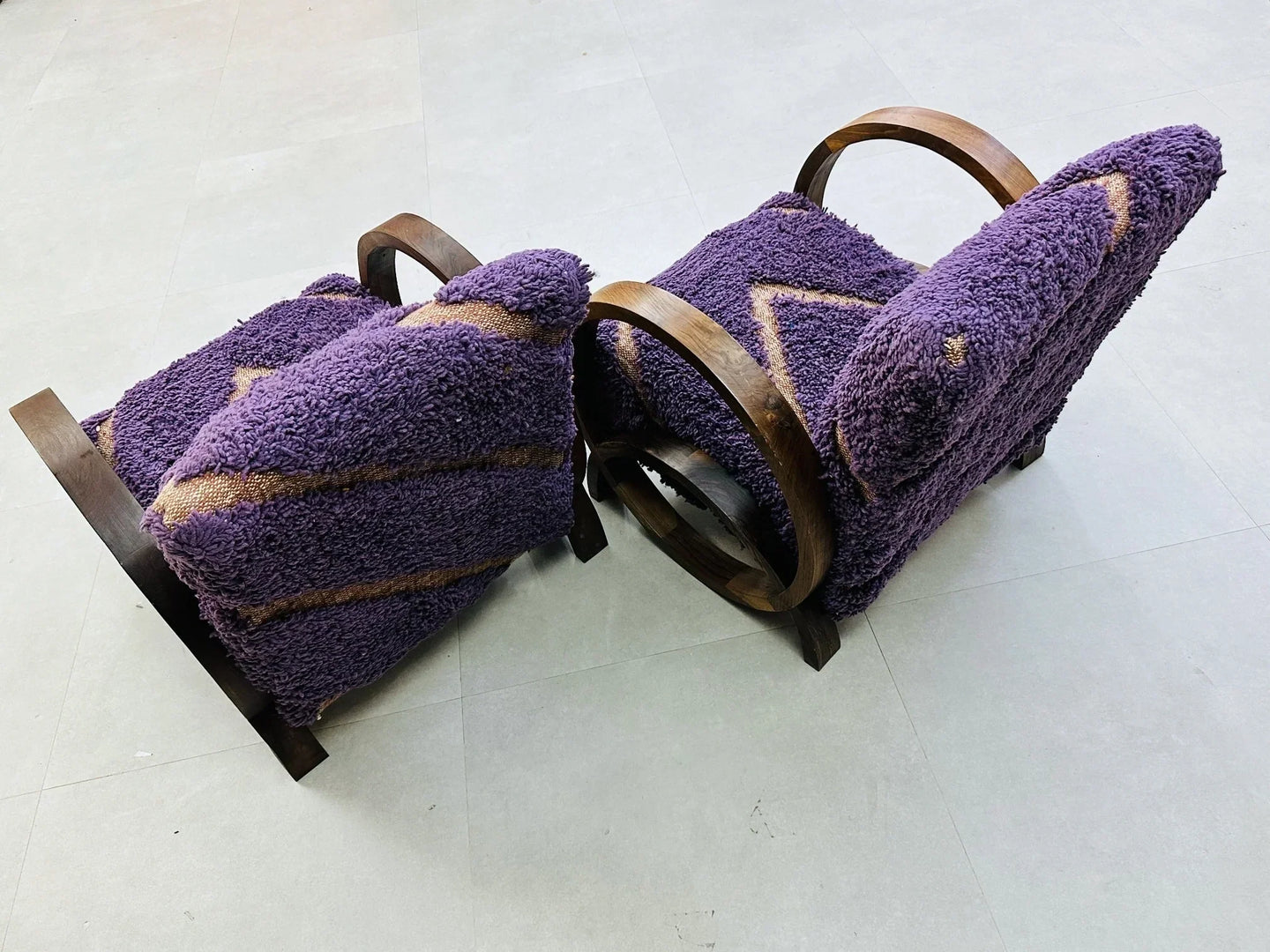 Add a splash of Moroccan charm to your home with these unique wool chairs, wrapped in a soft, deep purple upholstery highlighted by striking diagonal patterns. The beautifully curved walnut wood frame gives each chair a distinct, artistic touch, blending modern luxury with timeless craftsmanship. Perfect for creating a cozy and stylish corner in any room, these chairs invite comfort and elegance into your space.