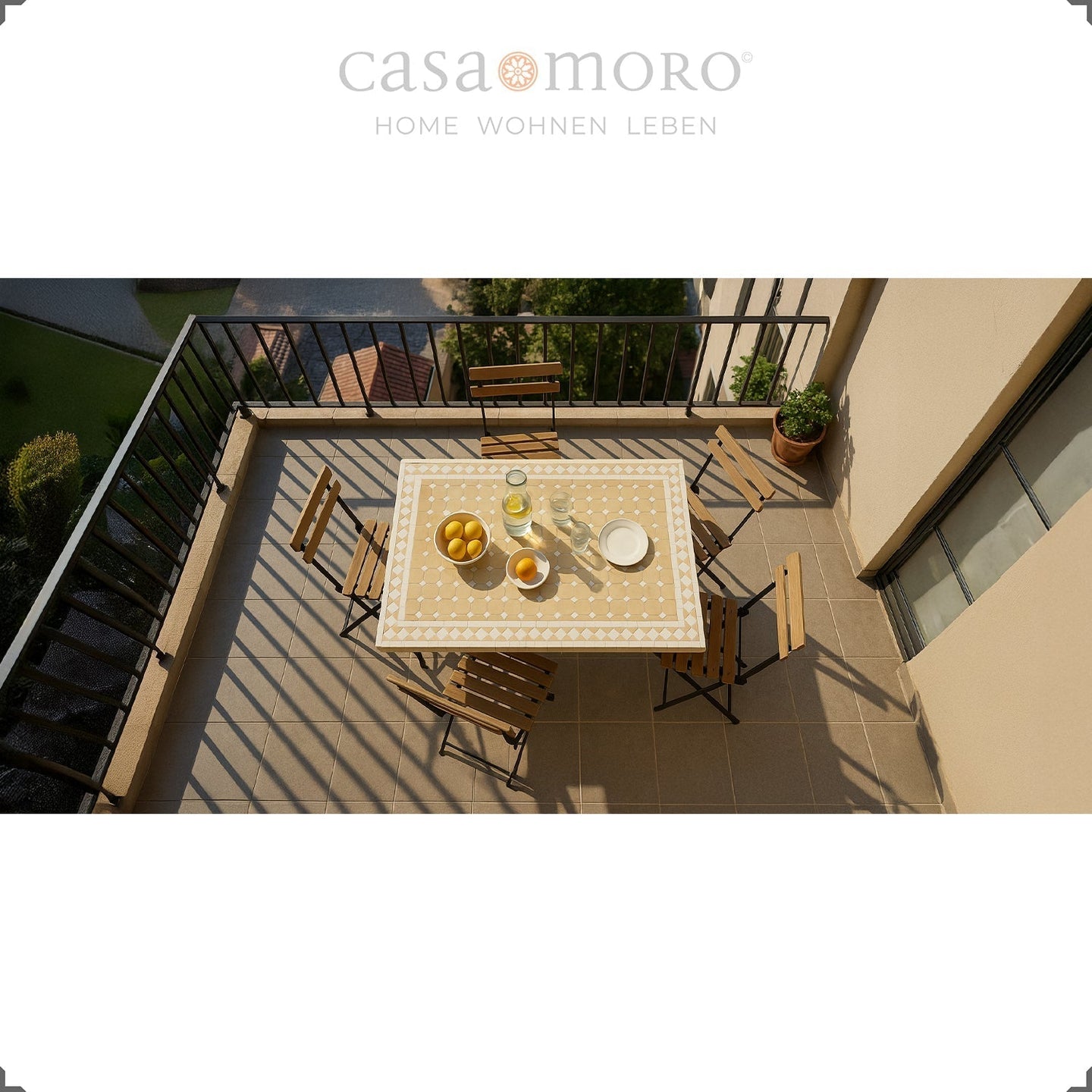 Depending on the light, white Zellije tiles look like precious mother of pearl. Especially when they are mosaic table surrounded by unglazed, light beige cotto tiles. White garden furniture fits particularly well with the romantic decorating style with filigree wrought iron tendrils, garden arbors and rose trellises.